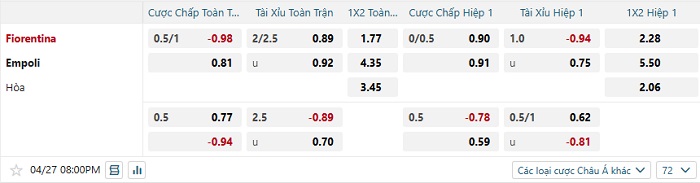 Tip kèo Châu Á full trận Fiorentina vs Empoli
