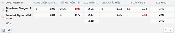 Tip kèo Châu Á hiệp 1 Gimcheon Sangmu vs Jeonbuk Hyundai