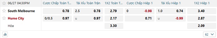 - Dự đoán tỷ số hiệp 1: South Melbourne 0 – 0 Hume City