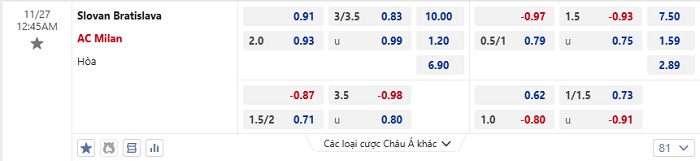 Tip kèo Châu Á hiệp 1 Slovan vs Milan
