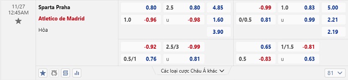 Tip kèo Châu Á full trận Sparta Praha vs Atletico Madrid