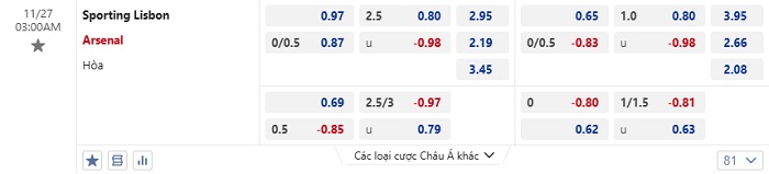 Tip kèo Châu Á hiệp 1 Sporting Lisbon vs Arsenal