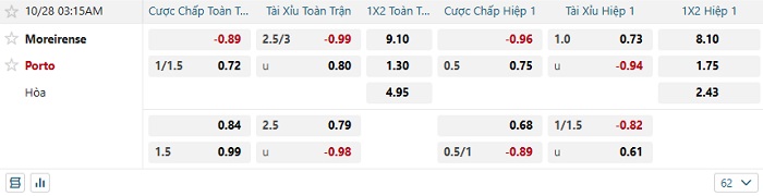 - Dự đoán tỷ số hiệp 1: Moreirense 0 – 1 Porto