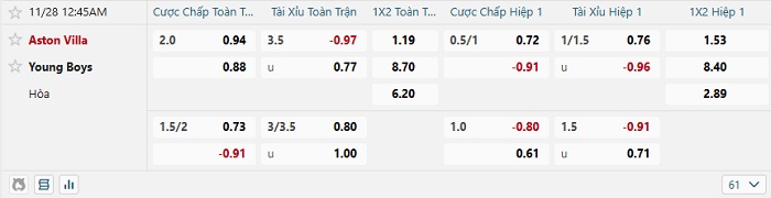 Tip kèo Châu Á full trận Aston Villa vs Young Boys