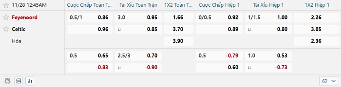 Tip kèo Châu Á hiệp 1 Feyenoord vs Celtic