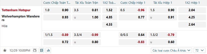 Tip kèo Châu Á hiệp 1 Tottenham vs Wolverhampton