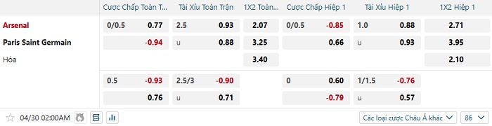 Tip kèo Châu Á hiệp 1 Arsenal vs PSG