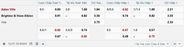 Tip kèo Châu Á full trận Aston Villa vs Brighton