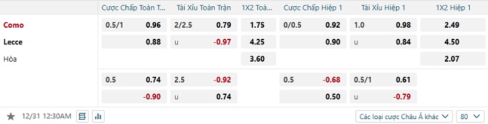 Tip kèo Châu Á hiệp 1 Como vs Lecce