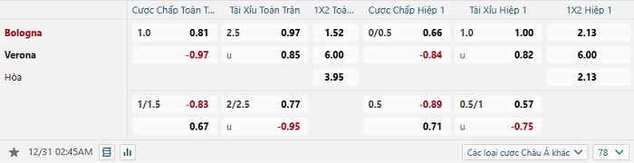 Tip kèo Châu Á hiệp 1 Bologna vs Verona