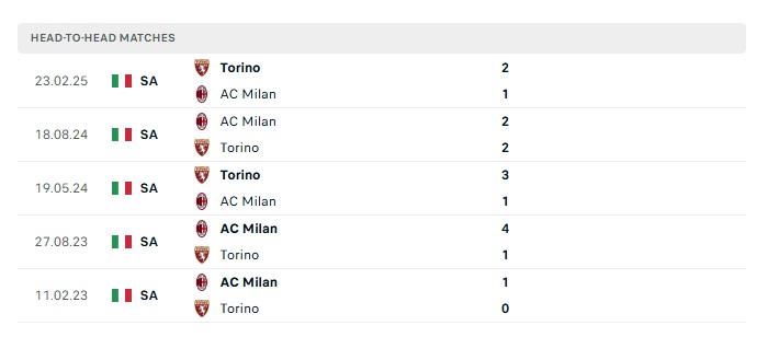 - Kèo tỷ số H2 Torino vs AC Milan: 0-2
