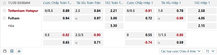 Bảng kèo bóng đá Tottenham vs Fulham
