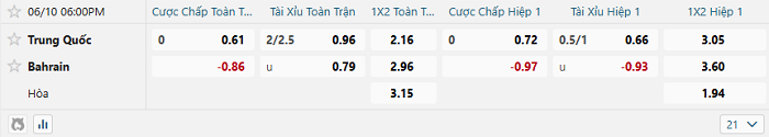 - Kèo tỷ số H2 Trung Quốc vs Bahrain: 1-0