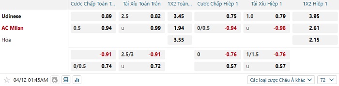 Soi kèo châu Á, kèo Udinese vs AC Milan