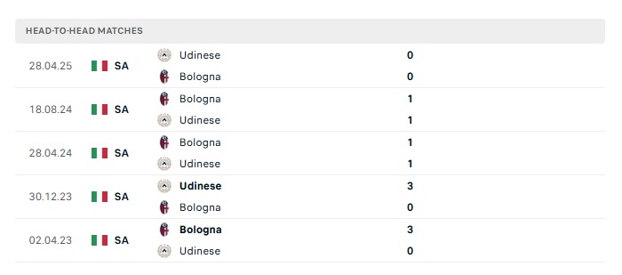 • Kèo tỷ số H2 Udinese vs Bologna: 0-1