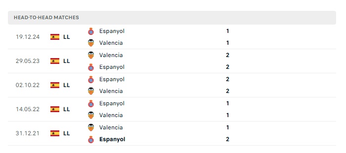 • Kèo tỷ số H2 Valencia vs Espanyol: 2-2