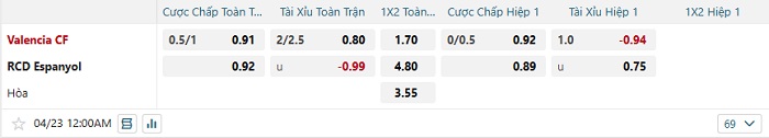Bảng tỷ lệ kèo nhà cái Valencia vs Espanyol