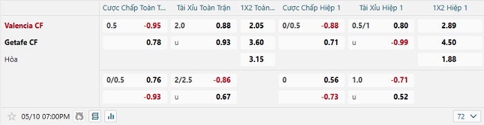 - Kèo tỷ số H1 Valencia vs Getafe: 1-0
