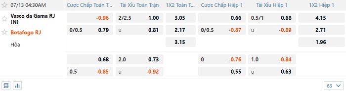 • Kèo tỷ số H1 Vasco vs Botafogo/RJ: 0-0