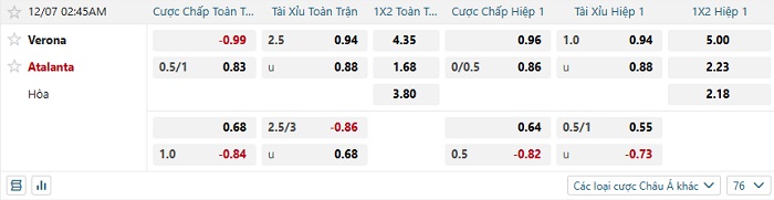- Kèo tỷ số H1 Verona vs Atalanta: 0-1