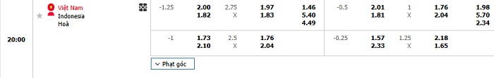 Bảng tỷ lệ kèo bóng đá Việt Nam vs Indonesia