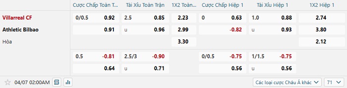 Bảng tỷ lệ kèo bóng đá hôm nay Villarreal vs Athletic Bilbao