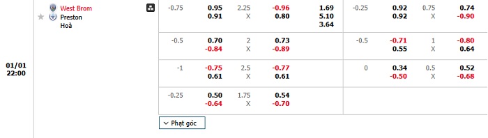 Bảng tỷ lệ kèo bóng đá West Brom vs Preston North End