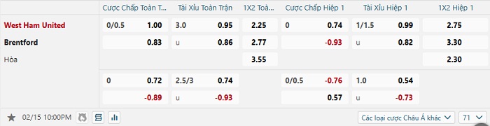 Bảng tỷ lệ kèo bóng đá West Ham Utd vs Brentford