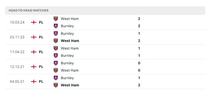 Lịch sử đối đầu West Ham Utd vs Burnley