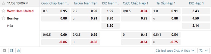 Bảng tỷ lệ kèo nhà cái West Ham Utd vs Burnley