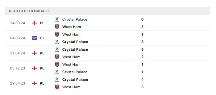 Lịch sử đối đầu West Ham Utd vs Crystal Palace