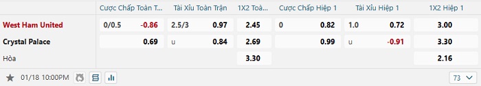 Bảng tỷ lệ kèo bóng đá West Ham Utd vs Crystal Palace