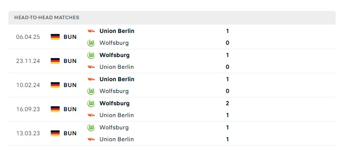 Lịch sử đối đầu Wolfsburg vs Union Berlin