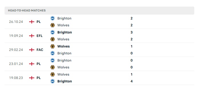 • Kèo tỷ số H2 Wolves vs Brighton: 0-0