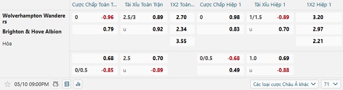Bảng tỷ lệ kèo bóng đá Wolves vs Brighton