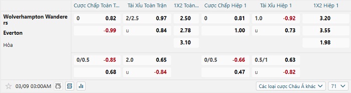 Bảng tỷ lệ kèo bóng đá Wolves vs Everton